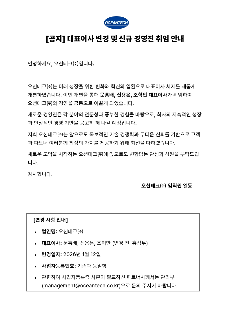 고객지원 홈페이지 이동 고객지원 알리는 바다 OCEAN TALK 고객문의 채용안내 AS문의/신청 알리는 바다 오션테크㈜의 소식을 알려드립니다 제목 대표이사 변경 및 신규 경영진 취임 안내 등록일 2026-01-15 11:52:31 조회 5871 첨부파일 대표이사 변경 및 신규 경영진 취임 안내.pdf_page_1.png 목록 이전 화면 이전글과 다음글 보기 구분 내용 이전글 2026 KSEG 한국지구물리·물리탐사학회 다음글 2025년도 한국해양학회 추계학술대회